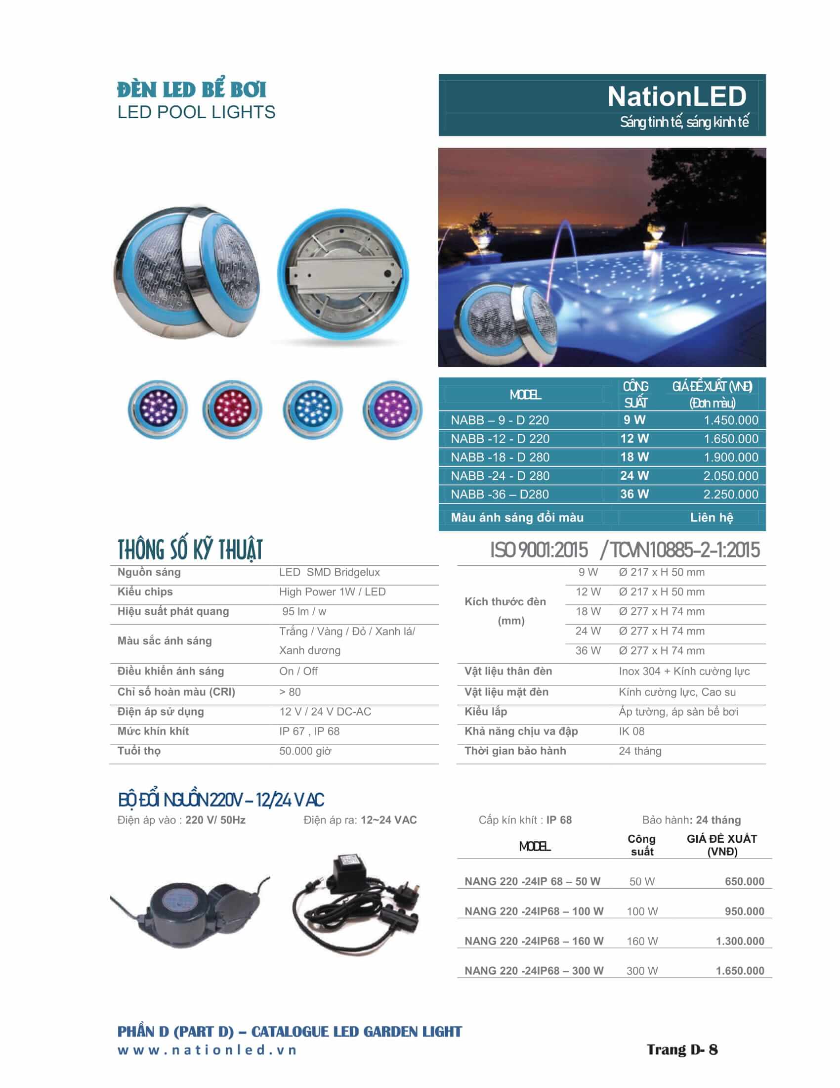 - Đèn được lắp đặt kiểu áp tường, áp sàn bể bơi. Ánh sáng đa dạng nhiều màu sắc như trắng, vàng, đỏ, xanh lá, xanh dương / RBG, ...