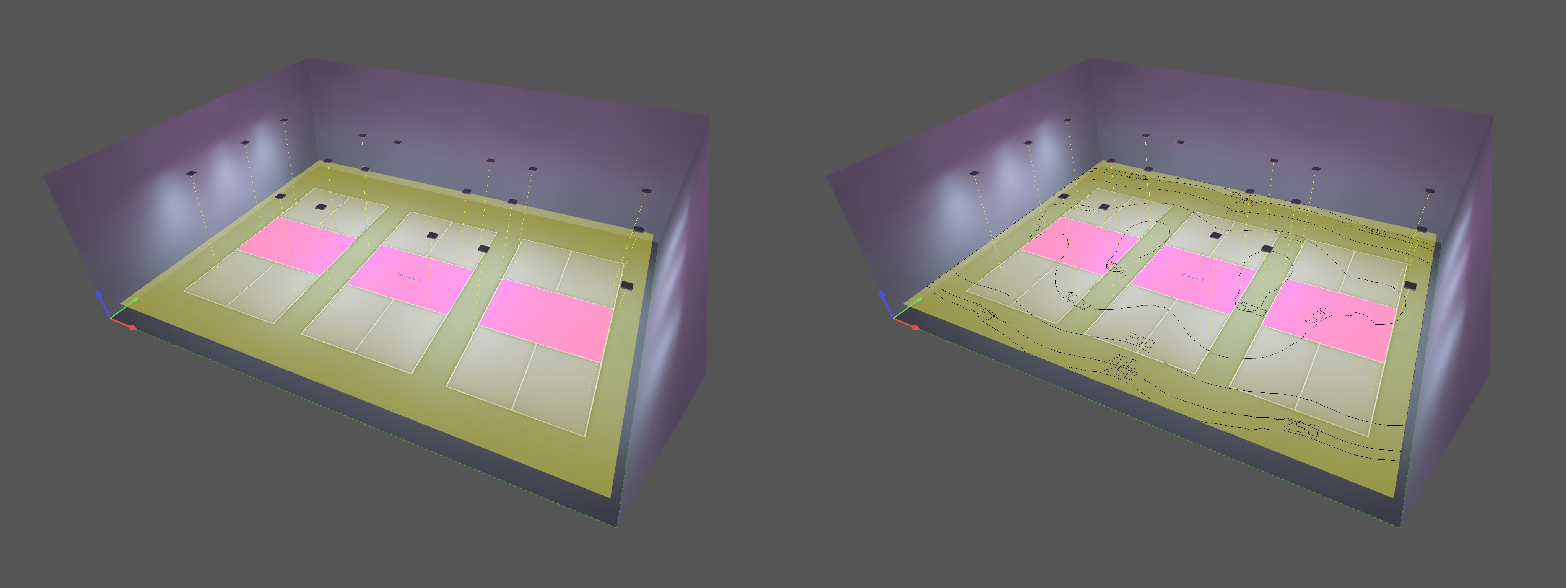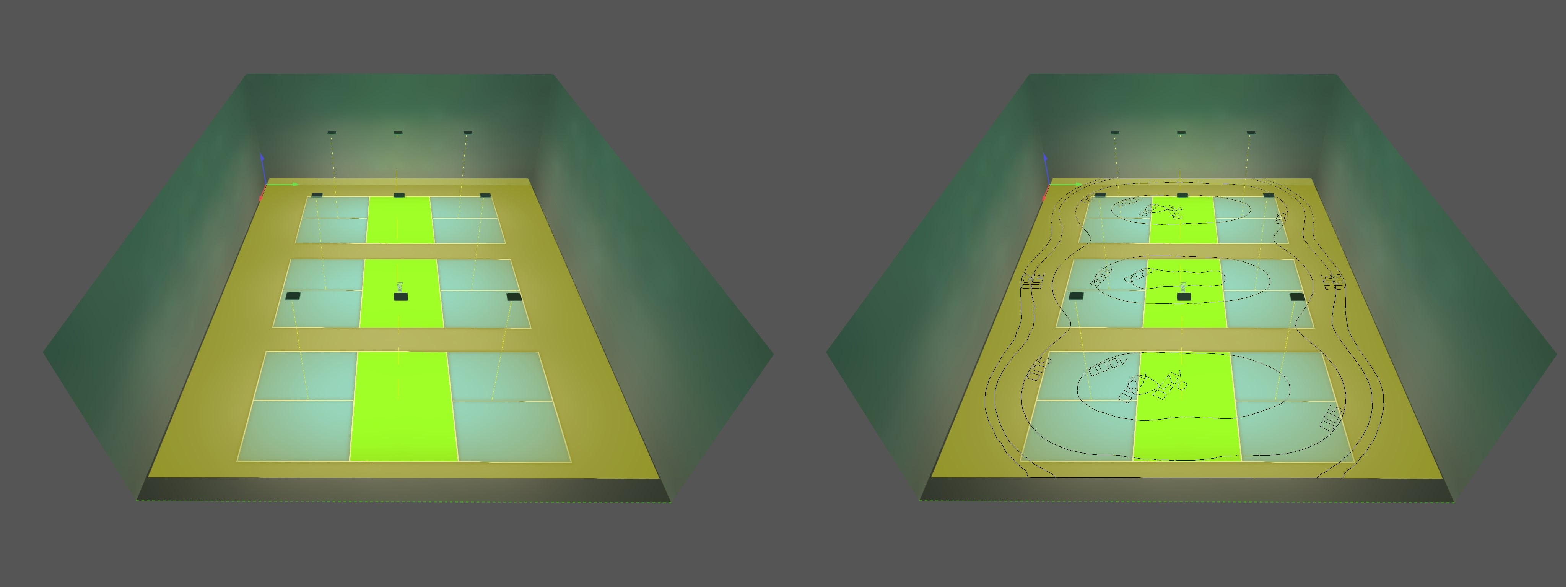 - Với mỗi sân sử dụng công suất đèn khác nhau, vị trí và độ cao đèn khác nhau cần được tư vấn cụ thể hơn. Đến với chúng tôi Quý khách được tư vấn, hỗ trợ thiết kế miễn phí bằng phần mềm thiết kế ánh sáng chuyên nghiệp Dialux, đảm bảo hiệu quả chiếu sáng cao nhất, chính xác nhất. Ảnh bên dưới là ảnh thiết kế chiếu sáng và ảnh thực tế ánh sáng tại sân Pickleball.