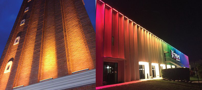 - Sử dụng kết hợp cùng hệ thống đèn âm nước, đèn âm đất, đèn pha led, .. trang trí cho tòa tháp, trung tâm thương mại, rạp phim, khu vui chơi giải trí, quán cafe, nhà hàng, … giúp cho chúng ta có thể dễ dàng quan sát tên tòa nhà, dễ dàng vui chơi, giải trí, ... vào ban đêm.