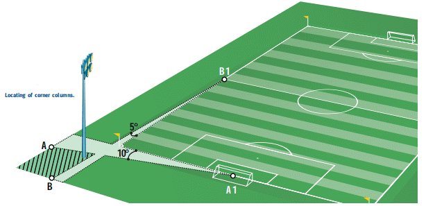 Các cột ở góc phải được đặt tối thiểu 10° về hai bên đường khung thành, giúp thủ môn có tầm nhìn không bị cản trở từ khung thành đến cờ phạt góc.