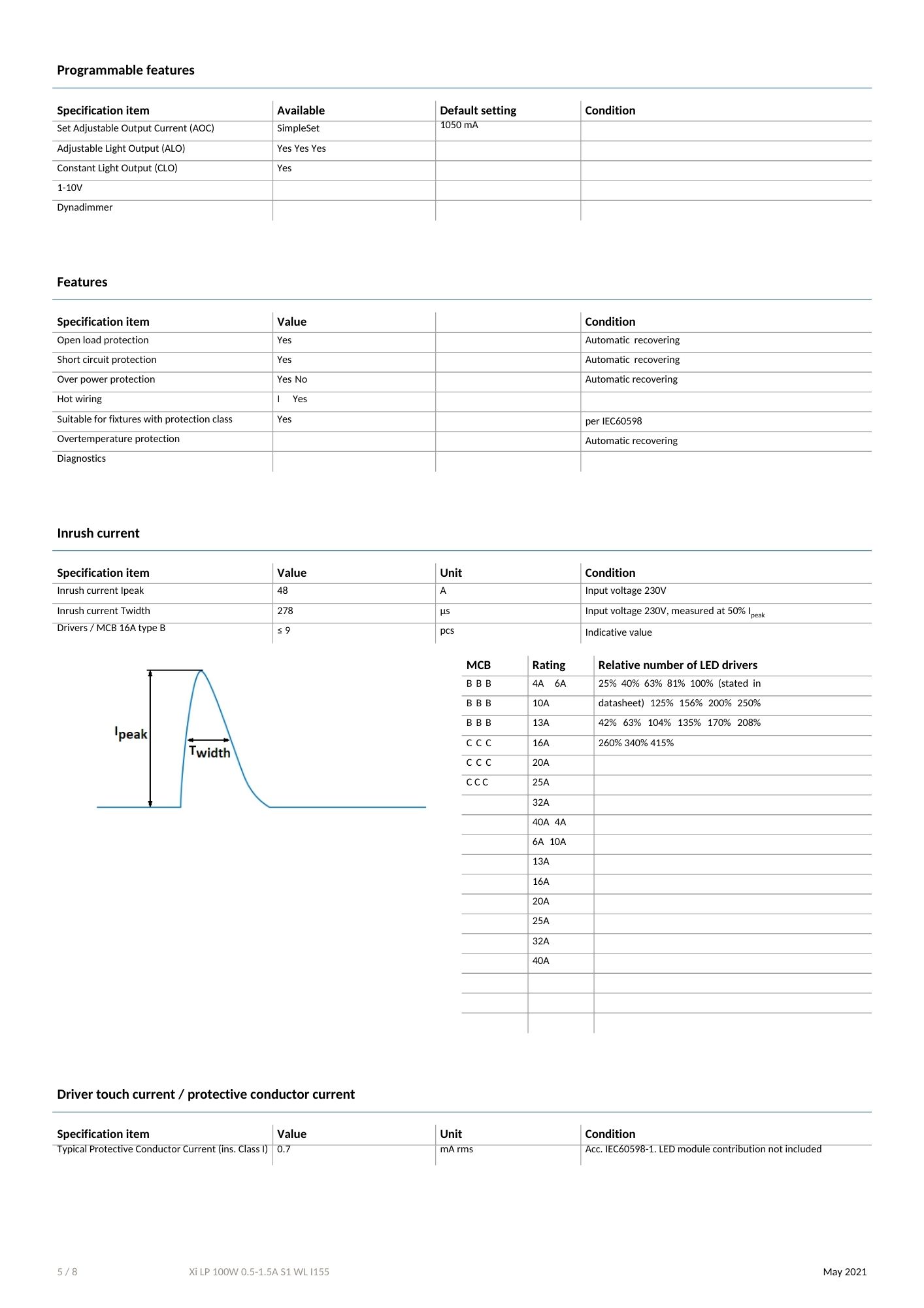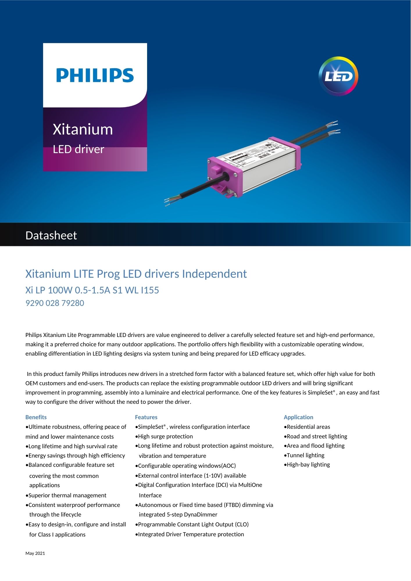 Driver Philips Xi LP 100W 0.5-1.5A S1 WL I155 thuộc dòng Driver cấp cấp, ưu điểm vượt trội là có thể tiết giảm 5 cấp công suất, hay Dimming 5 cấp; dim 1-10V, khả năng kết nối thông minh với điều khiển trung tâm. Ứng dụng nhiều trong chiếu sáng đường phố.
